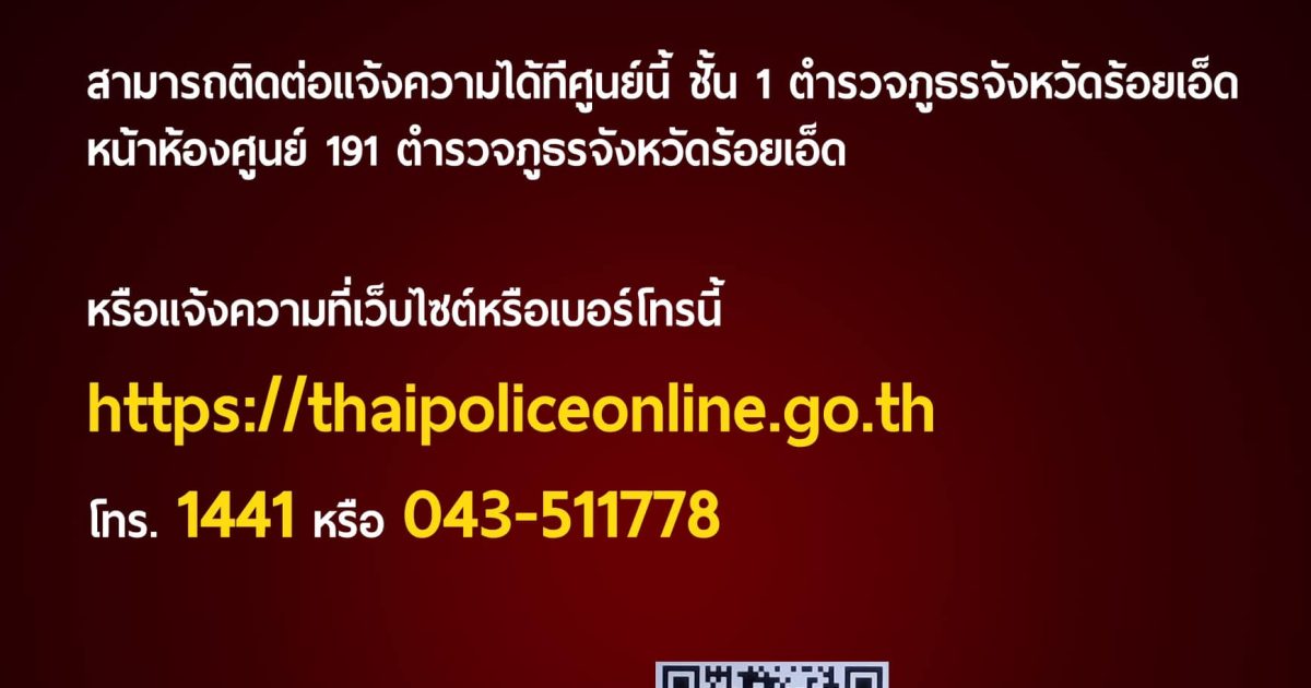 ศูนย์รับแจ้ง The Icon ร้อยเอ็ด 2 มกราคม 2025 โดย Nonghi / กิจกรรม/ข่าวประชาสัมพันธ์,กิจกรรม/ข่าวประชาสัมพันธ์,ข่าวประชาสัมพันธ์ ศูนย์รับแจ้งความร้องทุกข์กลุ่มคดี The ICON Group จำกัด ตำรวจภูธรจังหวัดร้อยเอ็ดสามารถติดต่อแจ้งความได้ที่ศูนย์นี้ ชั้น 1 ตำรวจภูธรจังหวัดร้อยเอ็ด หน้าห้อง ศูนย์ 191 ตำรวจภูธรจังหวัดร้อยเอ็ดหรือแจ้งความที่เว็บไซต์https://thaipoliceonline.go.th/หรือเบอร์โทรนี้โทร. 1441 หรือ 043-511778เอกสารที่ประชาชนต้องเตรียมตาม QR code นี้