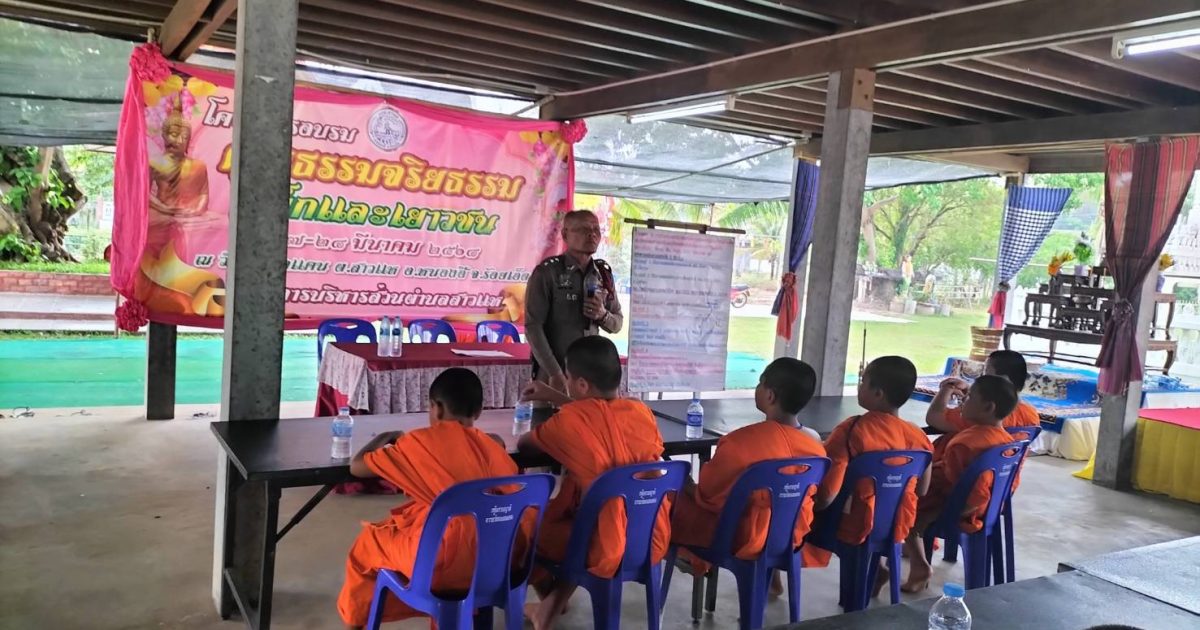 วิทยากรอบรมคุณธรรม จริยธรรม 10 เมษายน 2025 โดย Nonghi / กิจกรรม/ข่าวประชาสัมพันธ์,ข่าวกิจกรรม พ.ต.อ.ณัฏฐชัย พุดหล้า ผกก.สภ.หนองฮี มอบหมายให้ ร.ต.อ.บรรจง เพี้ยก่ำ รอง สว.(ป)ฯ ครูตำรวจแดร์ เป็นวิทยากรบรรยายให้ความรู้แก่สามเณรภาคฤดูร้อน ตามโครงการอบรมคุณธรรมจริยธรรมเด็กและเยาวชน ณ.วัดบ้านหนองแคน ต.สาวแห อ.หนองฮี จ.ร้อยเอ็ด
