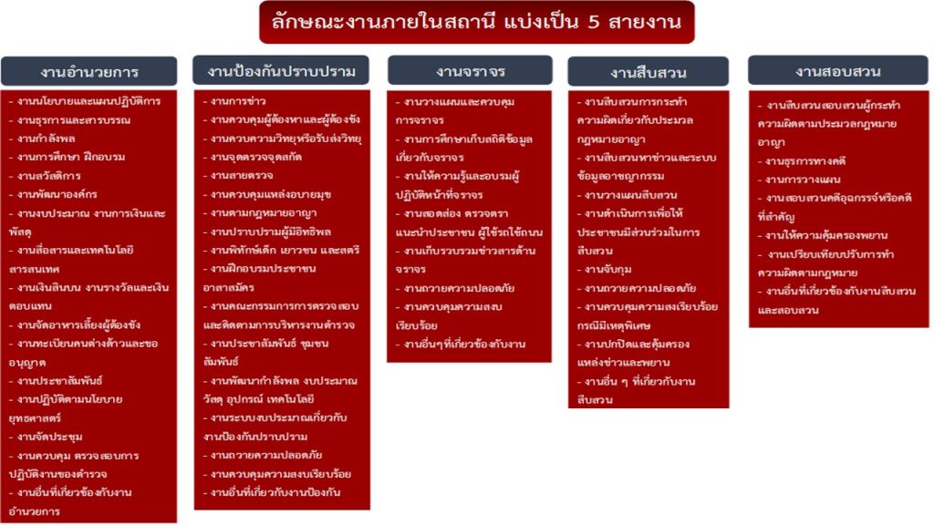 1) งานอำนวยการ มีหน้าที่เกี่ยวกับการอำนวยการ การวางแผน การตรวจสอบติดตามและประเมินผลงานที่เกี่ยวกับนโยบาย ยุทธศาสตร์ และแผนงานของสถานีตำรวจ งานการบริหารบุคลากร งานจเรตำรวจงานกิจการพิเศษ งานความมั่นคง การศึกษา การฝึกอบรม งานวิชาการ สวัสดิการ การพัฒนา การบริหารจัดการ งบประมาณ การเงิน การพัสดุ การพลาธิการและสรรพาวุธ การส่งกำลังบำรุง รวมทั้งลักษณะงานอื่น ๆ ที่เกี่ยวข้องหรือเป็นส่วนประกอบของงานดังกล่าว เพื่อส่งเสริมหรือสนับสนุนการปฏิบัติงานของสถานีตำรวจ